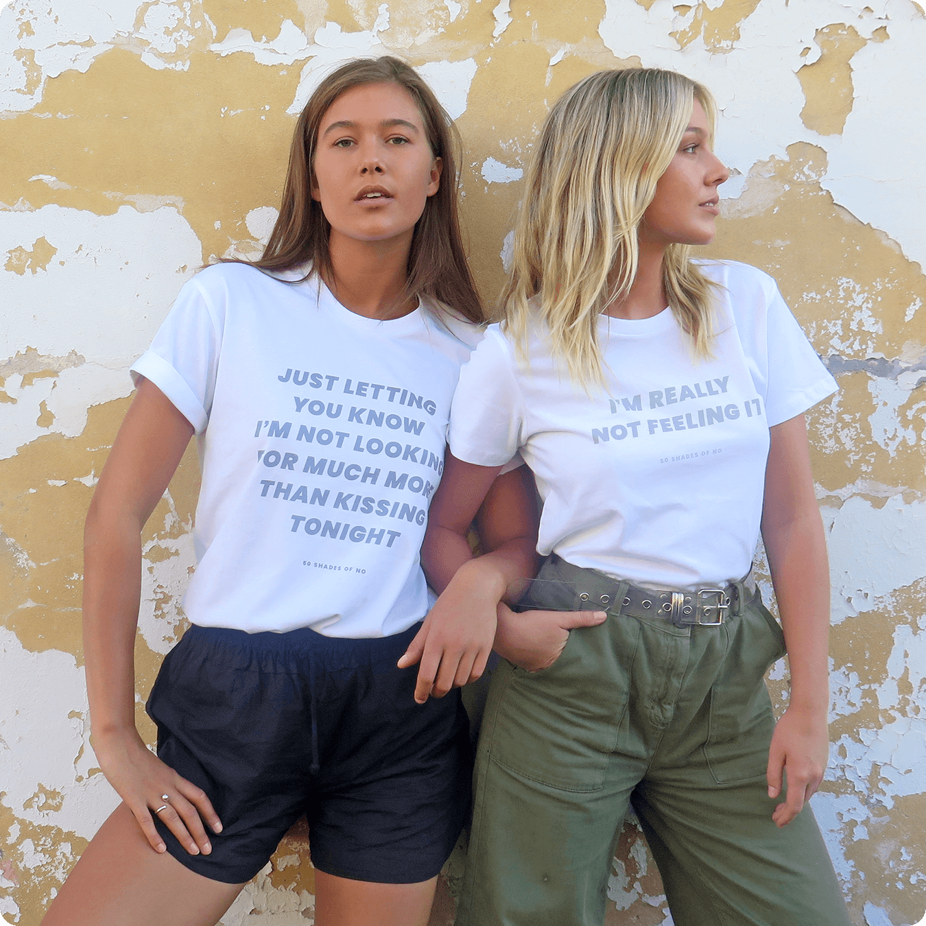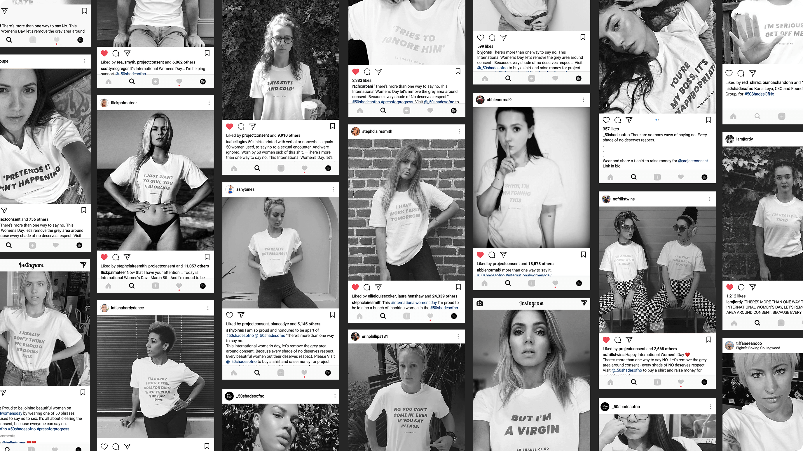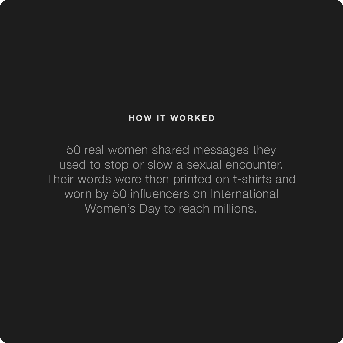 50 real women gave us 50 verbal or physical cues they used to try to stop or slow a sexual encounter. We printed these cues on t-shirts in 50 shades of grey. On International Women’s Day 50 influencers committed to wear and share a t-shirt on their social channels, spreading the message to millions.