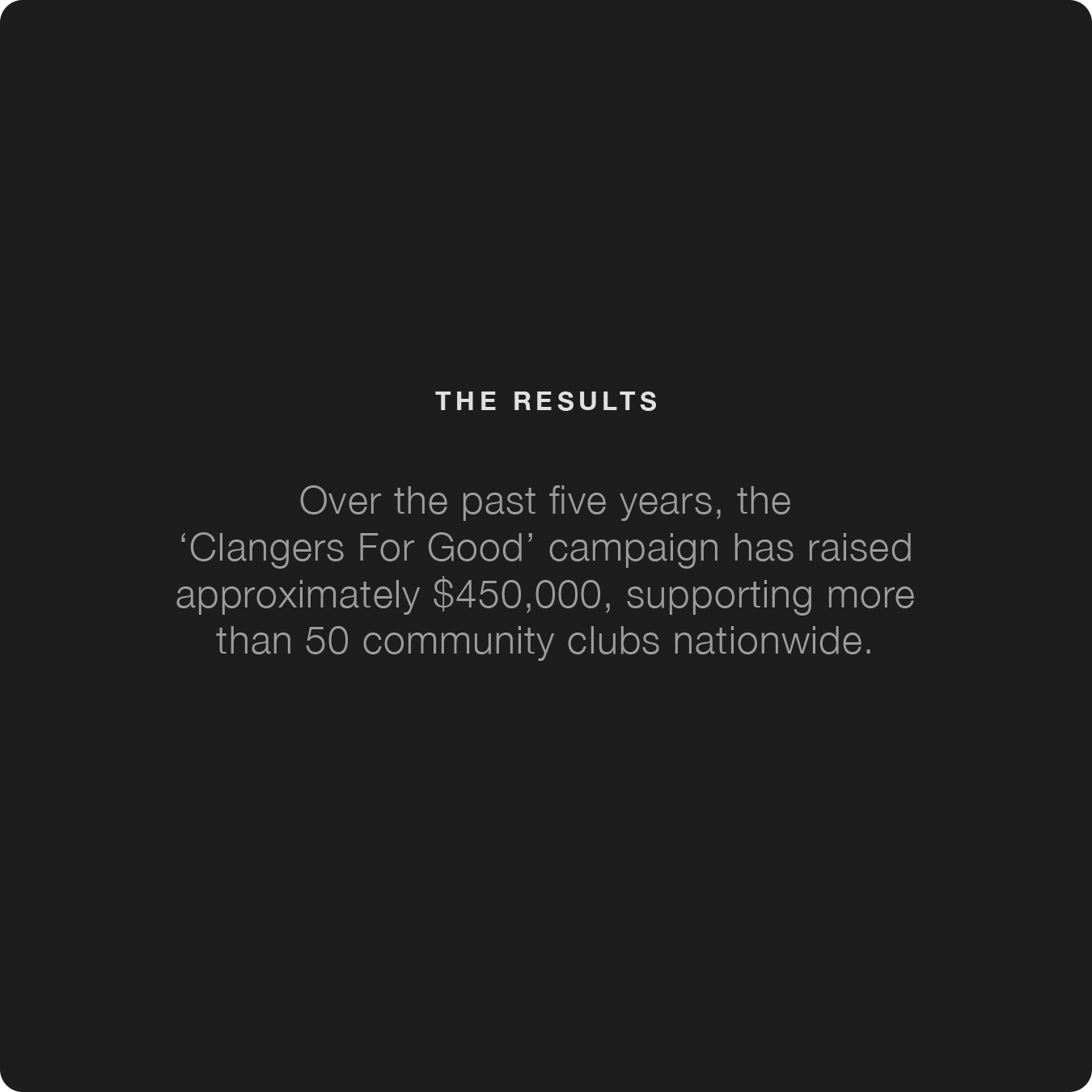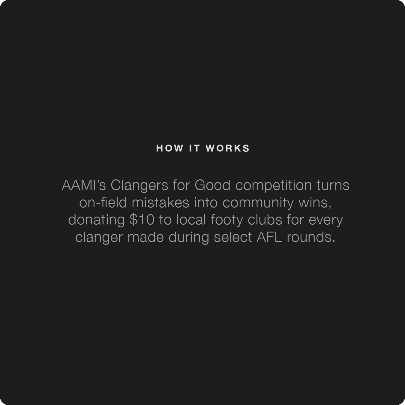 For years, local footy clubs have struggled to stay afloat due to dwindling funds and increasing operational costs. In partnership with the AFL, we launched the AAMI 'Clangers for Good' campaign, a sponsorship program to support and strengthen grassroots footy.